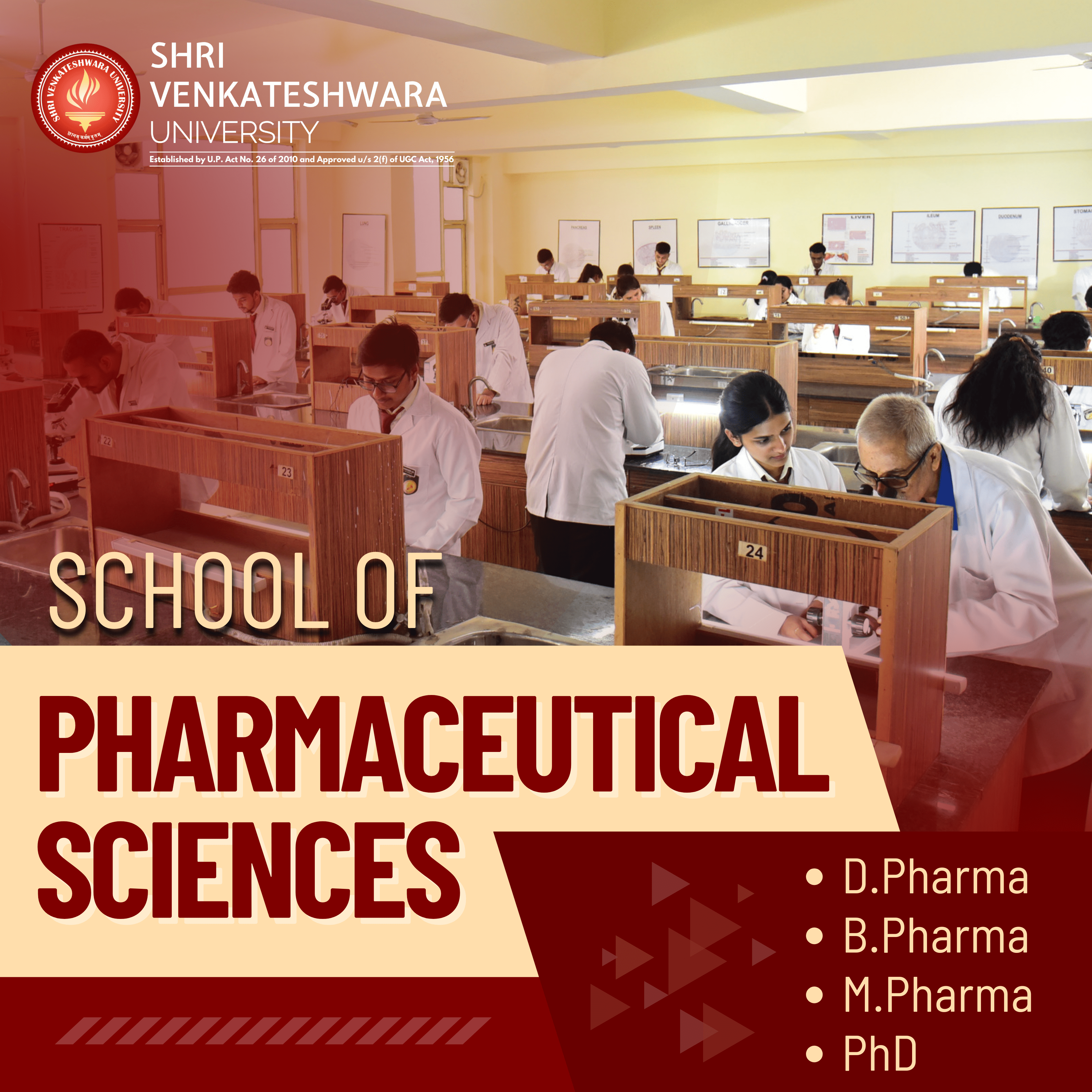 The School of Pharmacy (SOP) at Shri Venkateshwara University is a prestigious institution known for its commitment to excellence and innovation in pharmaceutical education. Offering a wide range of undergraduate and postgraduate programs, SOP ensures students receive a comprehensive education blending theoretical knowledge with practical application to meet the evolving demands of the pharmaceutical sector.